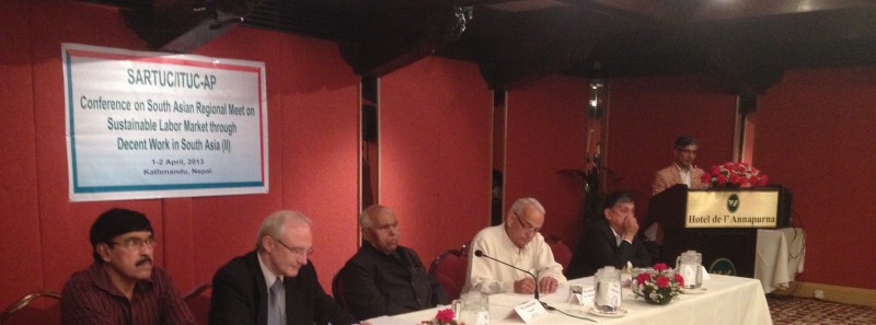 The SARTUC/ILO/ ITUC-AP Focal Persons Workshop on ‘Coordination of Action in Regard to the Protection of Migrant Workers’ was held in Kathmandu between 20 to 21 December, 2013. The program was organized by the South Asian Regional Trade Union Council (SARTUC), International Labour Organisation (ILO), and the International Trade Union Confederation – Asia Pacific (ITUC-AP). Apart from representatives of the organizing institutions, the Workshop involved the participation of trade unionists from across the SAARC region. Mr. Laxman Basnet, General Secretary of SARTUC, initiated the program as a felicitator. Â